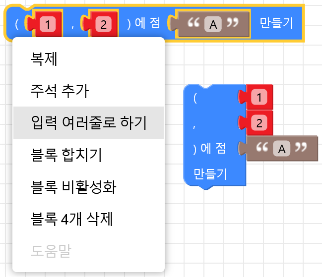 대부분의 블록들은 자신의 하위 부분블록을 갖고 있다. 또한, 거의 기본적으로 하위 부분블록은 상위 블록 내에서 가로로 나열되어 있다. 부분블록 자리에 가로로 긴 블록을 끼워 넣다 보면, 코딩 중에 블록을 편집하기 불편할 때가 있다. 이러한 경우에 상위 블록에 '입력 여러줄로 하기'를 사용하면, 하위 부분블록을 세로로 나열할 수 있다.
