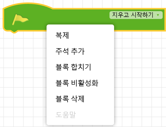 블록을 삭제하는 명령이다. 이 명령을 사용하는 대신에 블록을 작업공간 우측면 하단에 있는 휴지통 위로 드래그 앤드 드롭할 수도 있다. 특히, 휴지통을 클릭하면 버려진 블록이 차례대로 나열되어 있어 필요한 경우에 다시 작업공간으로 가져올 수 있다.